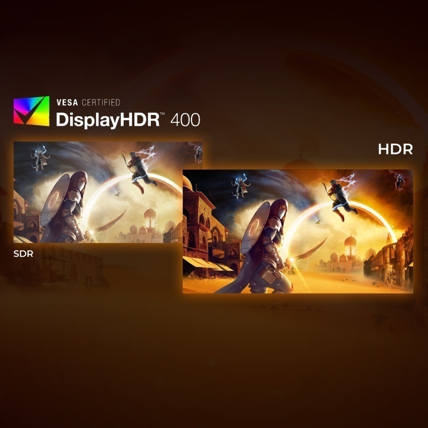 Même le plus bas niveau de la fonctionnalité HDR (Haut Dynamic Range) applique un surclassement considérable aux moniteurs ordinaires. Le pic de luminance de 400 cd/m² permet à votre écran de parfaire la qualité d'image avec de multiples spectres chromatiques1 et un contraste plus diversifié. Le2 certificat VESA assure la richesse des dét3ails et dépeint de faço4n réaliste les univers des jeux et des films.